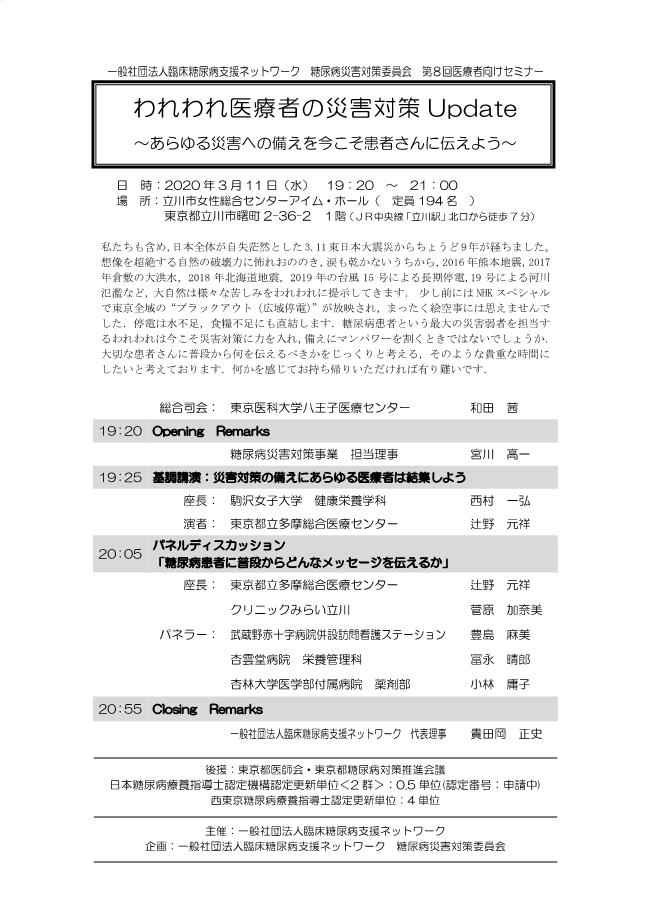 - 【中止】臨床糖尿病支援ネットワーク 糖尿病災害対策委員会 第8回医療者向けセミナー