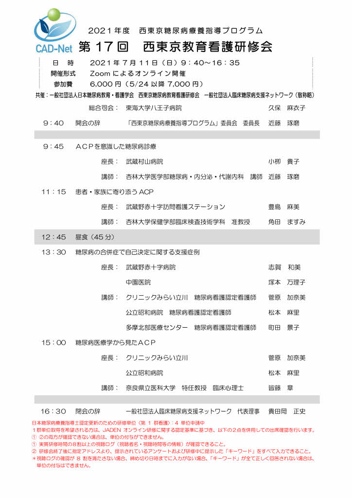 - 【オンライン】第17回西東京教育看護研修会 [2021年度 西東京糖尿病療養指導プログラム]