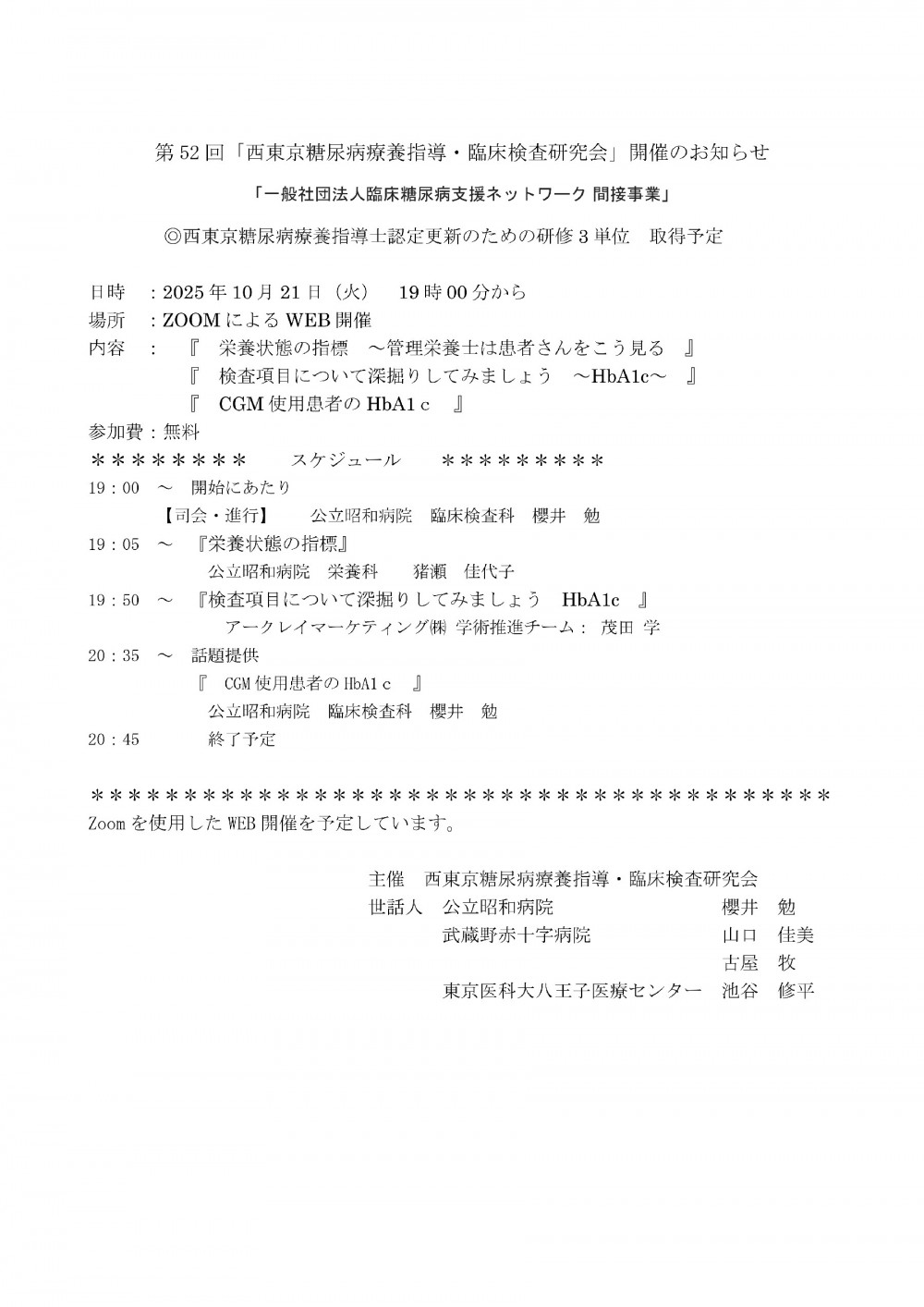 - 【オンライン】第52回西東京糖尿病療養指導・臨床検査研究会