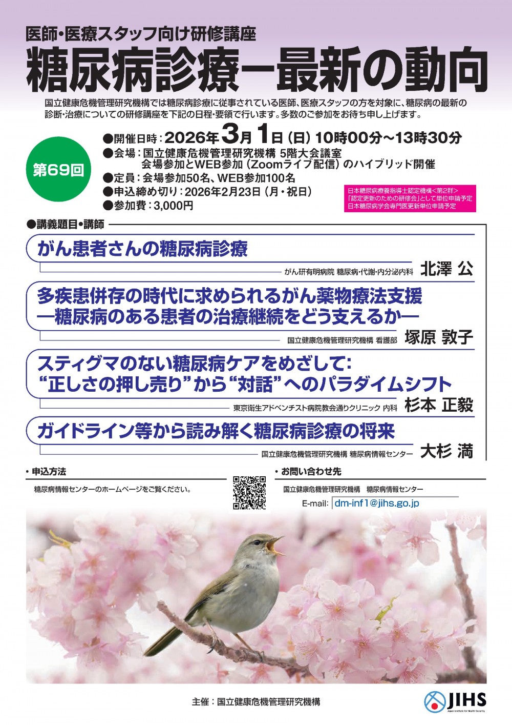 - 糖尿病研修講座事務局 メールアドレス:dm-inf1@jihs.go.jp